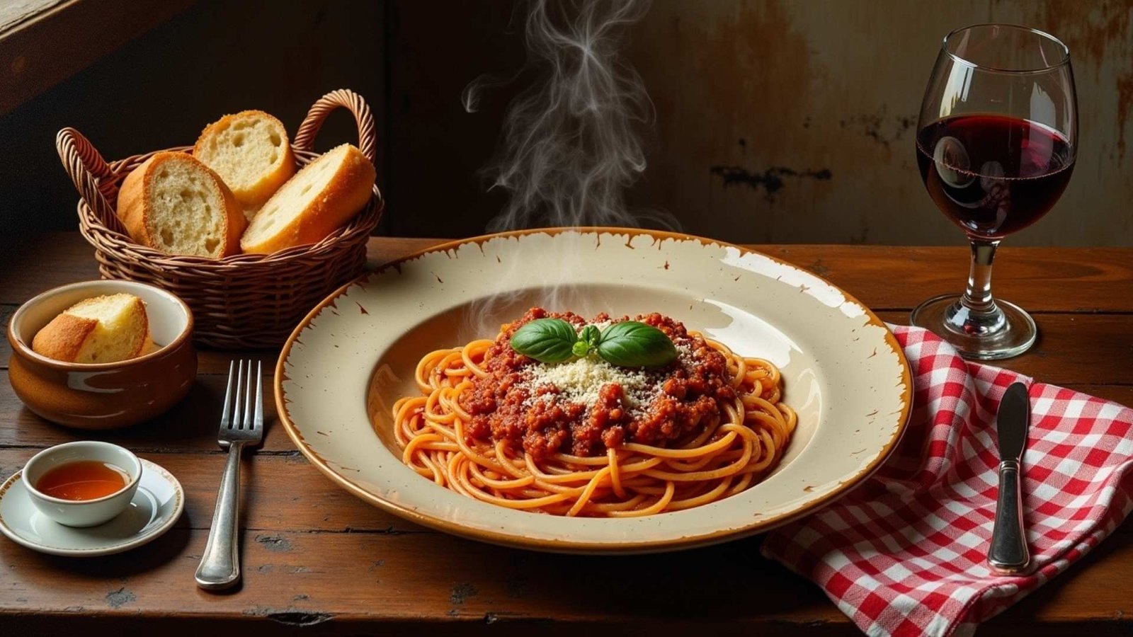 But what makes this dish truly special is the way it’s served: a rustic ceramic plate, a red-checkered napkin, a glass of red wine, and a basket of crusty bread. The scene evokes a cozy Italian kitchen, filled with warmth, laughter, and the aroma of home-cooked goodness.